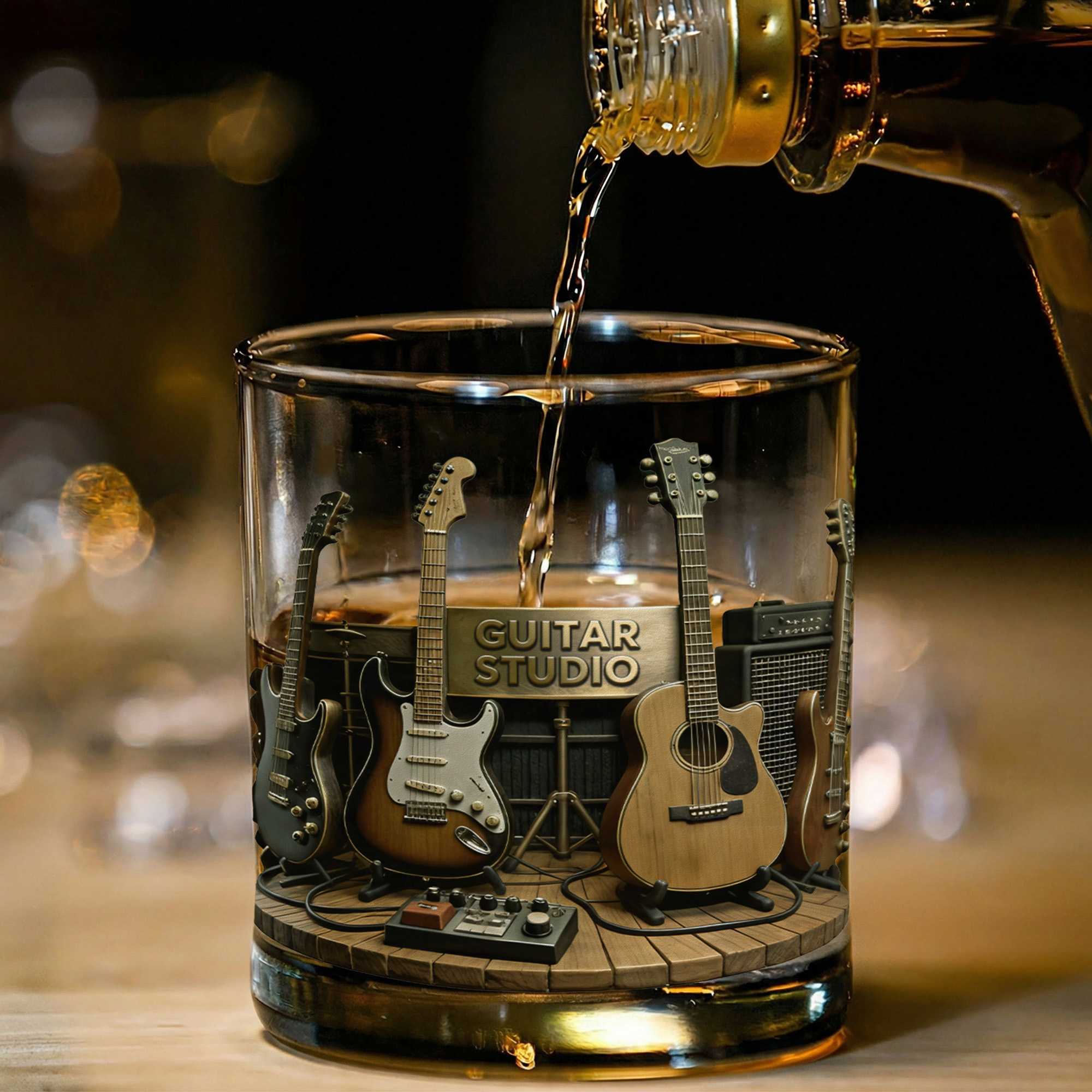 Studio-Inspired Guitar Design - This 10oz whiskey glass features a music studio theme with detailed guitar elements, capturing the vibe of a creative recording space. The design blends electric guitar visuals with a clean bar-style look, giving it a bold yet relaxed feel for music lovers.